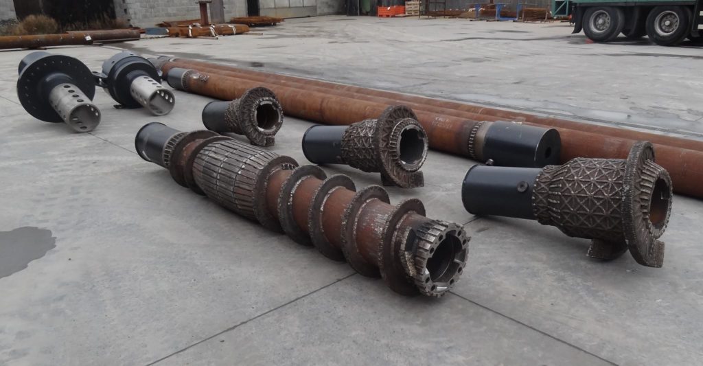 Next week, two foundation machines can be equipped with new Olivier full displacement drilling tools. The flange that comes underneath the rotary head is equipped with a standard Olivier Coupling that can handle up to 55Ton/meter of torque. In this way, tubes can be connected underneath for the necessary drilling depth. Underneath is a auger head for cylindrical piles or for the helical Olivier Pile.