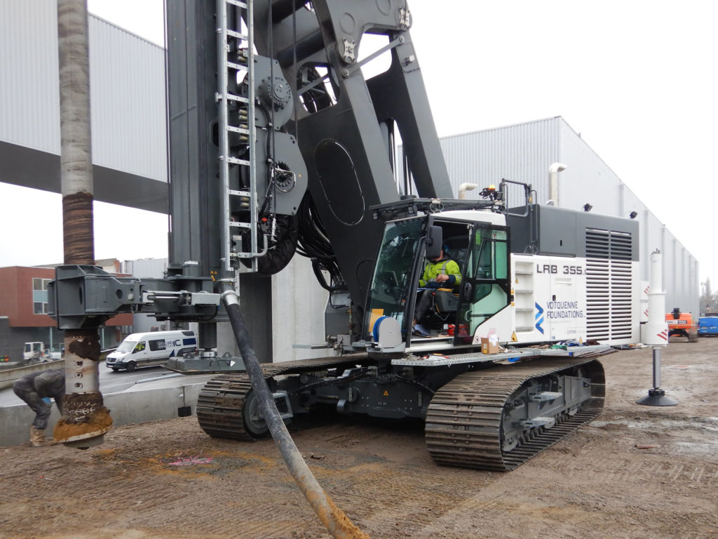Le troisième Liebherr LRB355.1 de Votquenne Foundations est à nouveau entièrement équipé d’outils de forage Olivier pour pieux à refoulement. Le moteur de forage BAT450.1 est équipé d’un coupleur Olivier XL et d’une pièce de réduction à coupleur Olivier standard avec les tiges de forage correspondantes. En bas se trouve une tarière Olivier d41/61 type Votquenne. Cette configuration fonctionne dans un système de béton ouvert où le béton et les armatures sont placés dans les tiges de forage.
